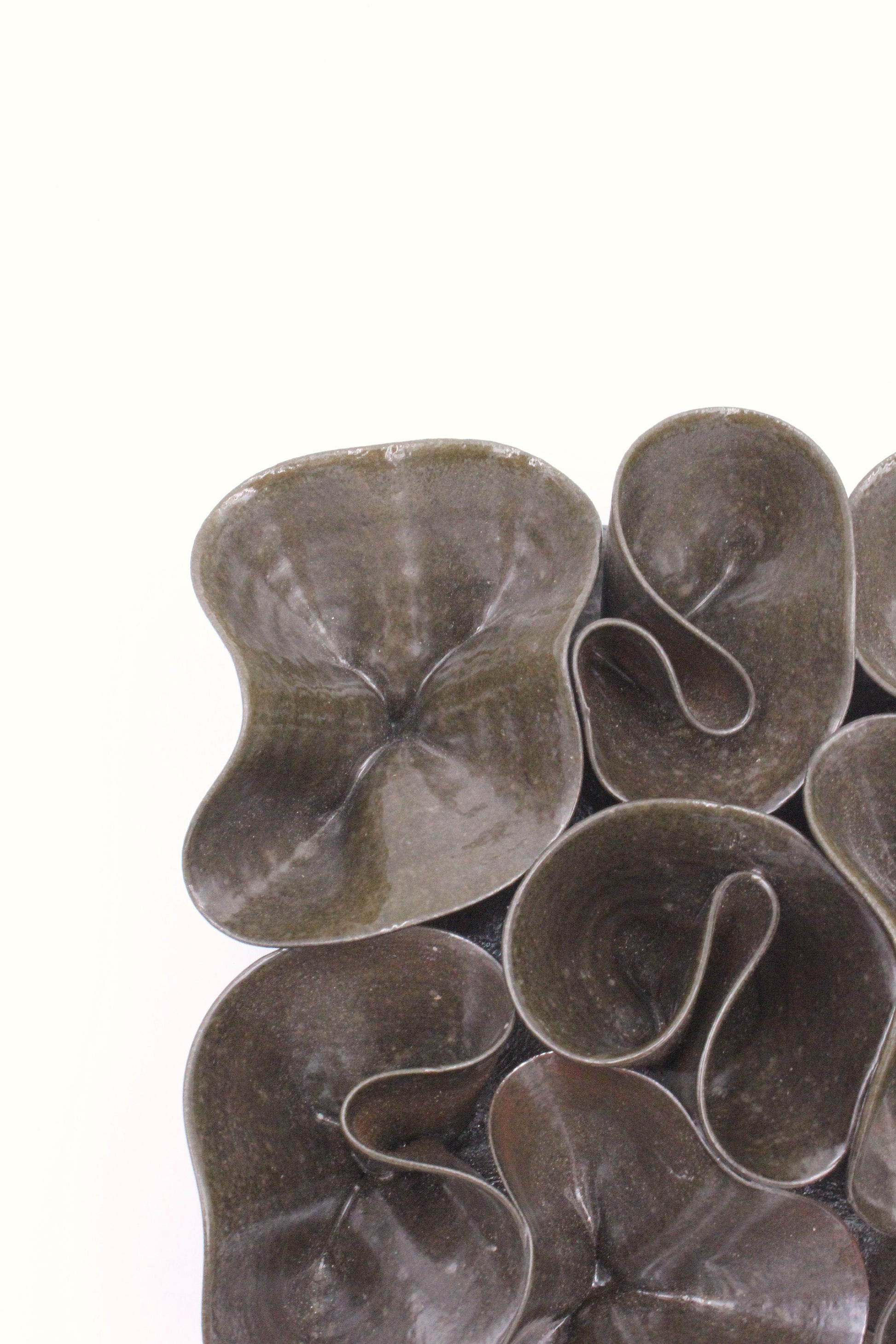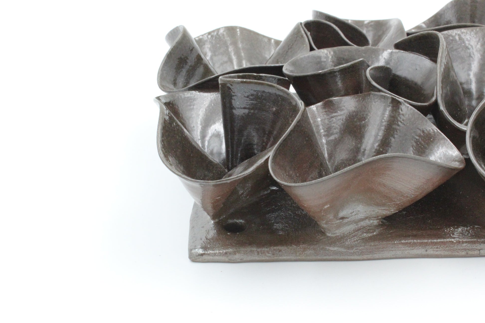 Drejad och skulpterad vägghängd skulptur i stengodslera. Saltbränd i vedugn