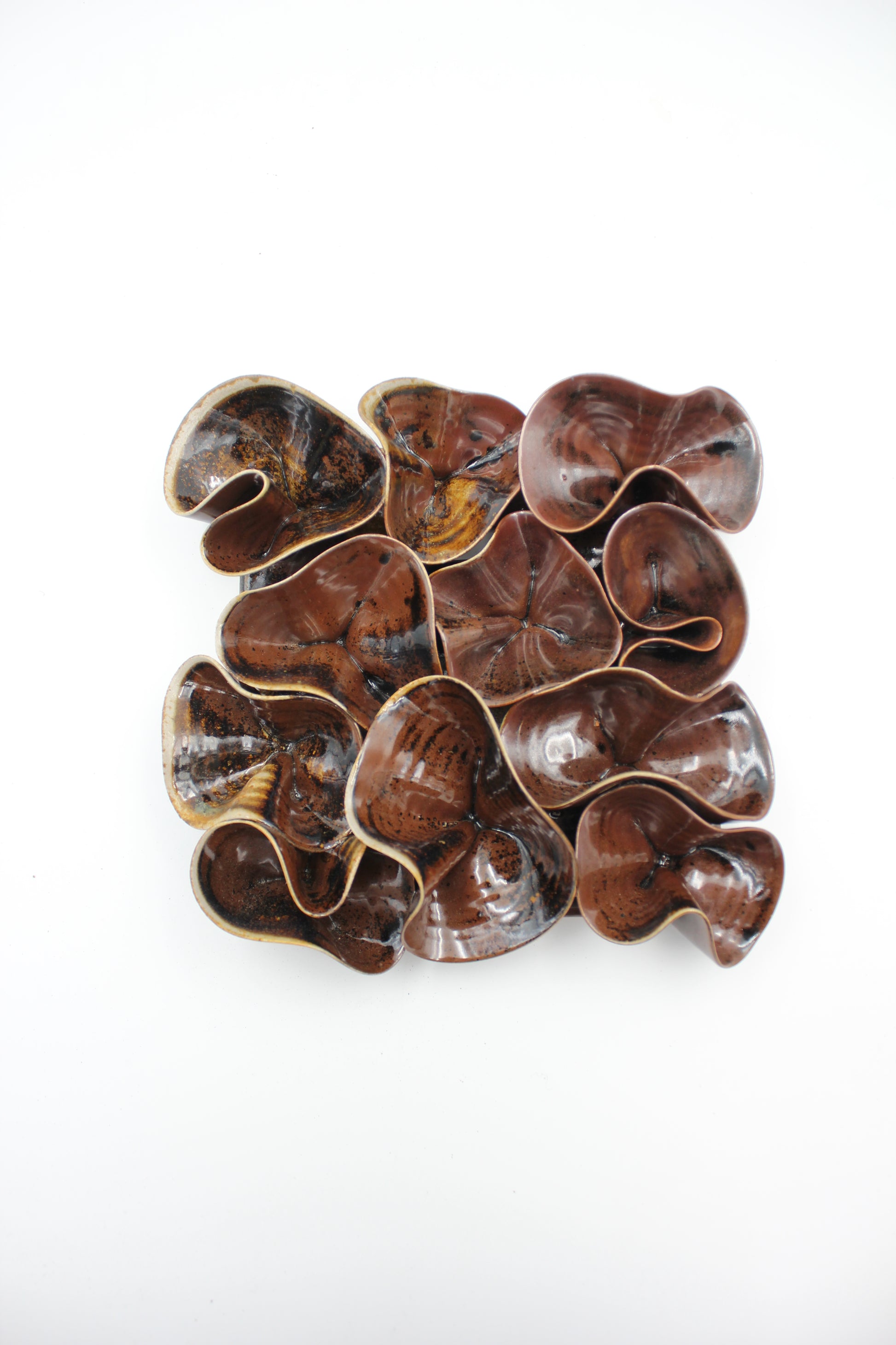 Drejad och skulpterad vägghängd skulptur i stengodslera. Bränd i vedugn där eld och aska skapar ett avtryck på keramiken.