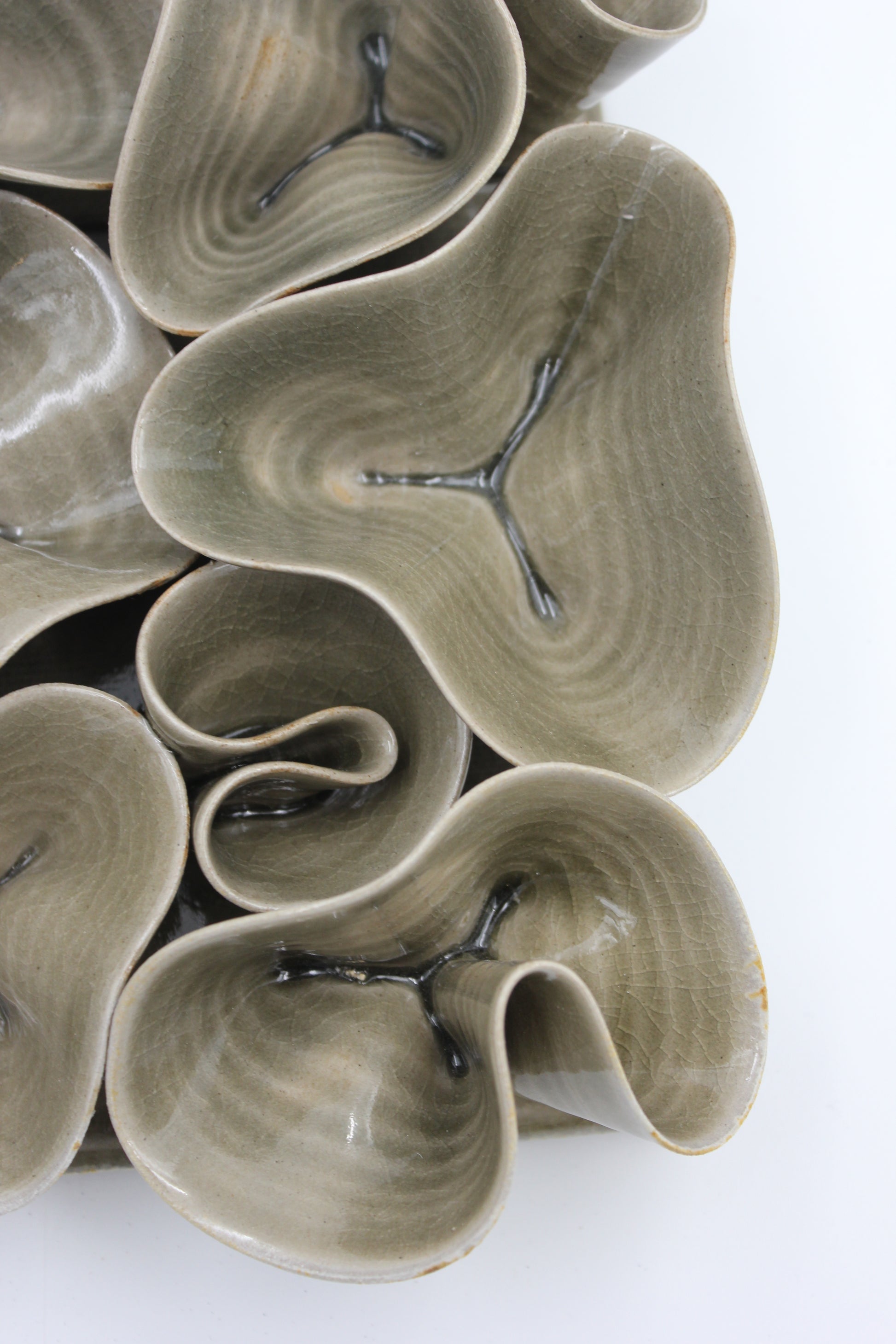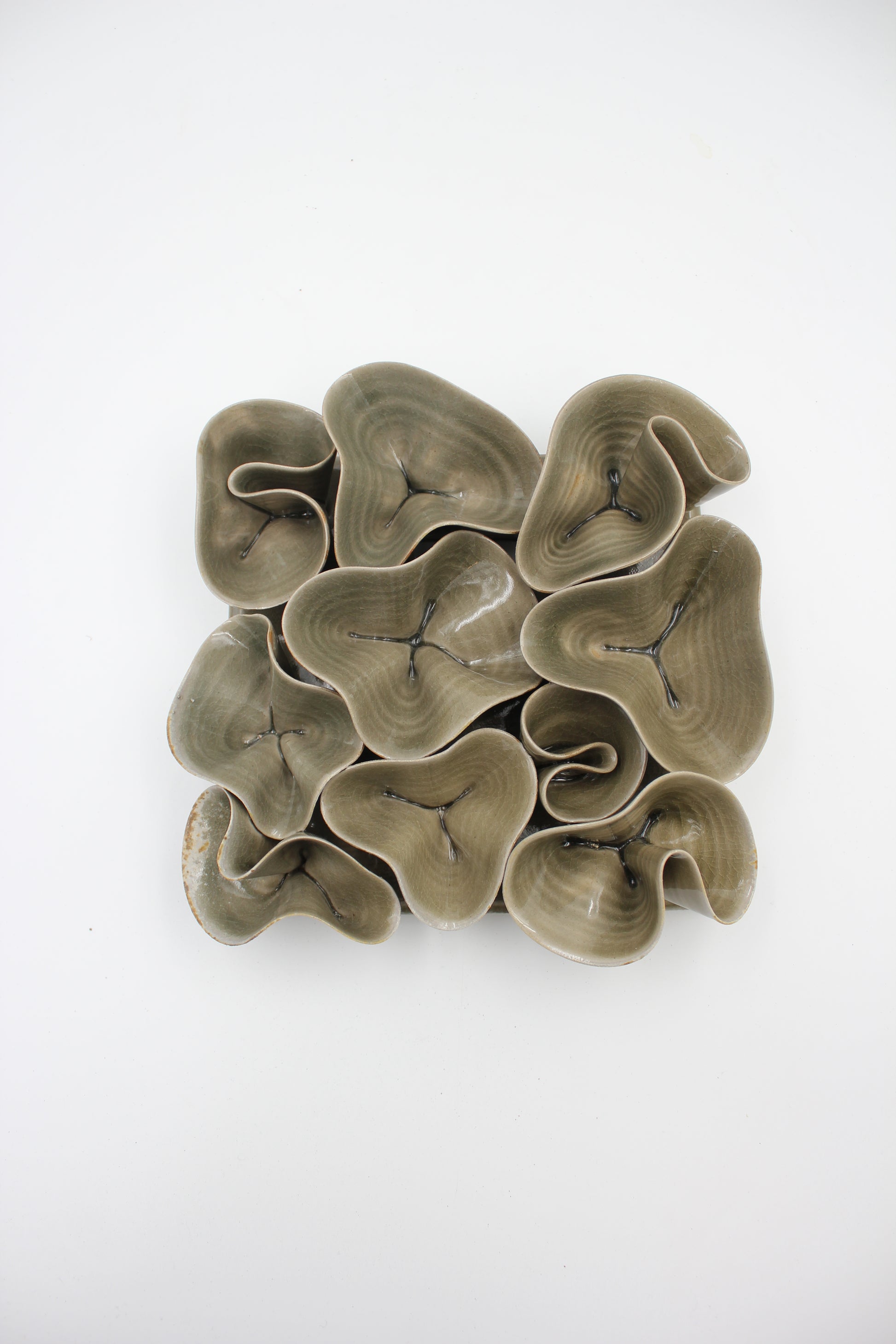 Drejad och skulpterad vägghängd skulptur i stengodslera. Bränd i vedugn där eld och aska skapar ett avtryck på keramiken.