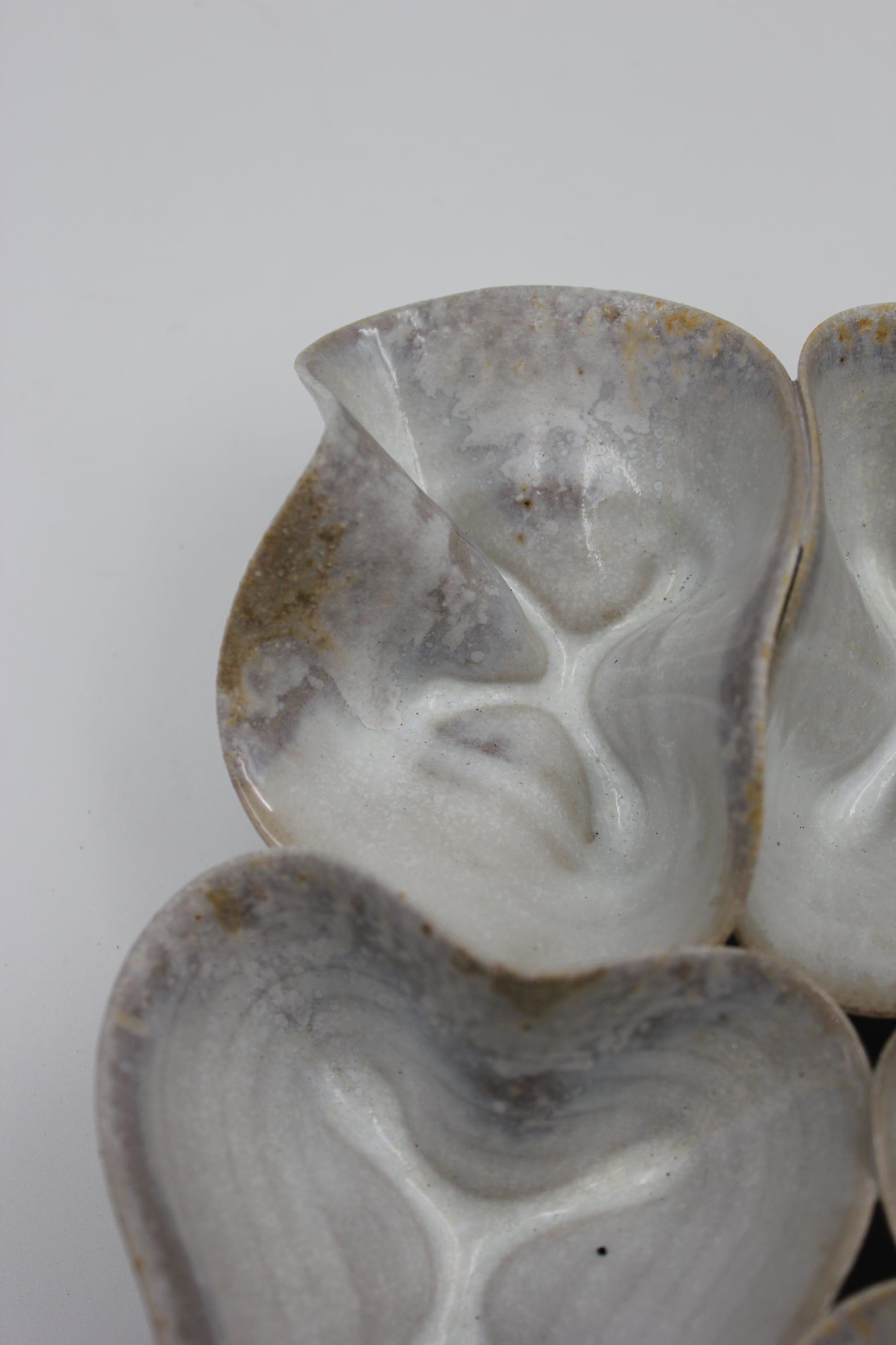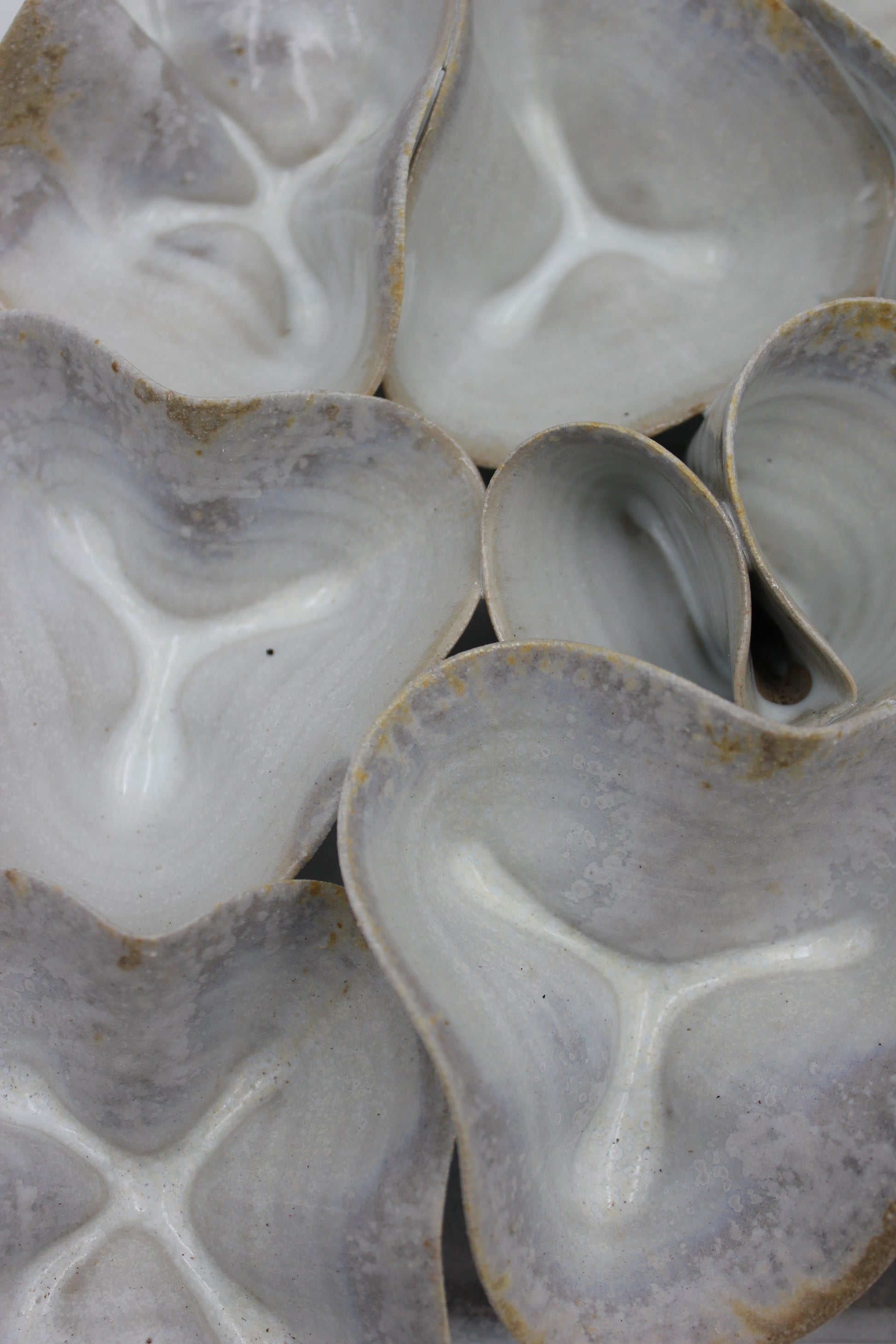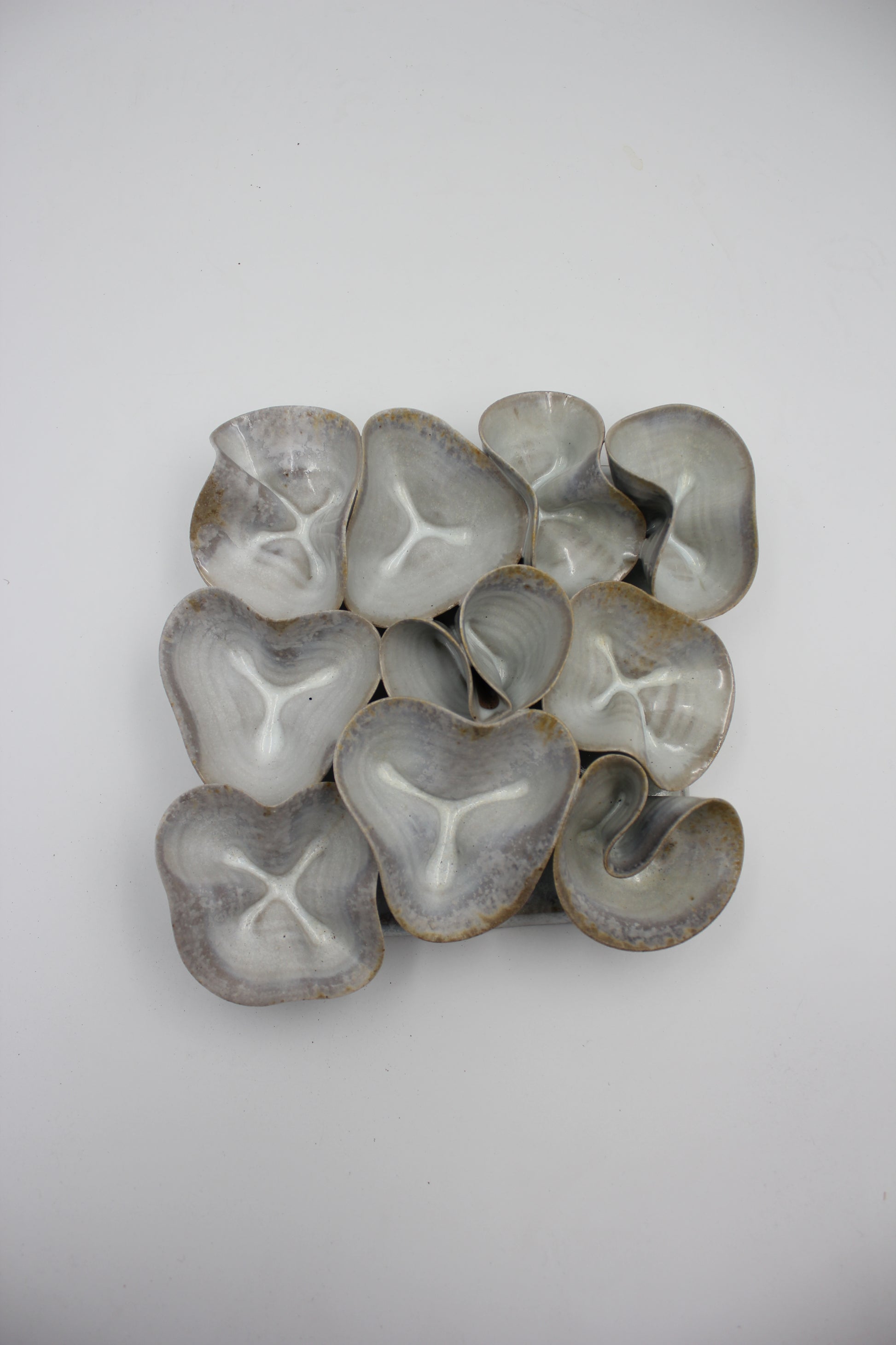 Drejad och skulpterad vägghängd skulptur i stengodslera. Bränd i vedugn där eld och aska skapar ett avtryck på keramiken.