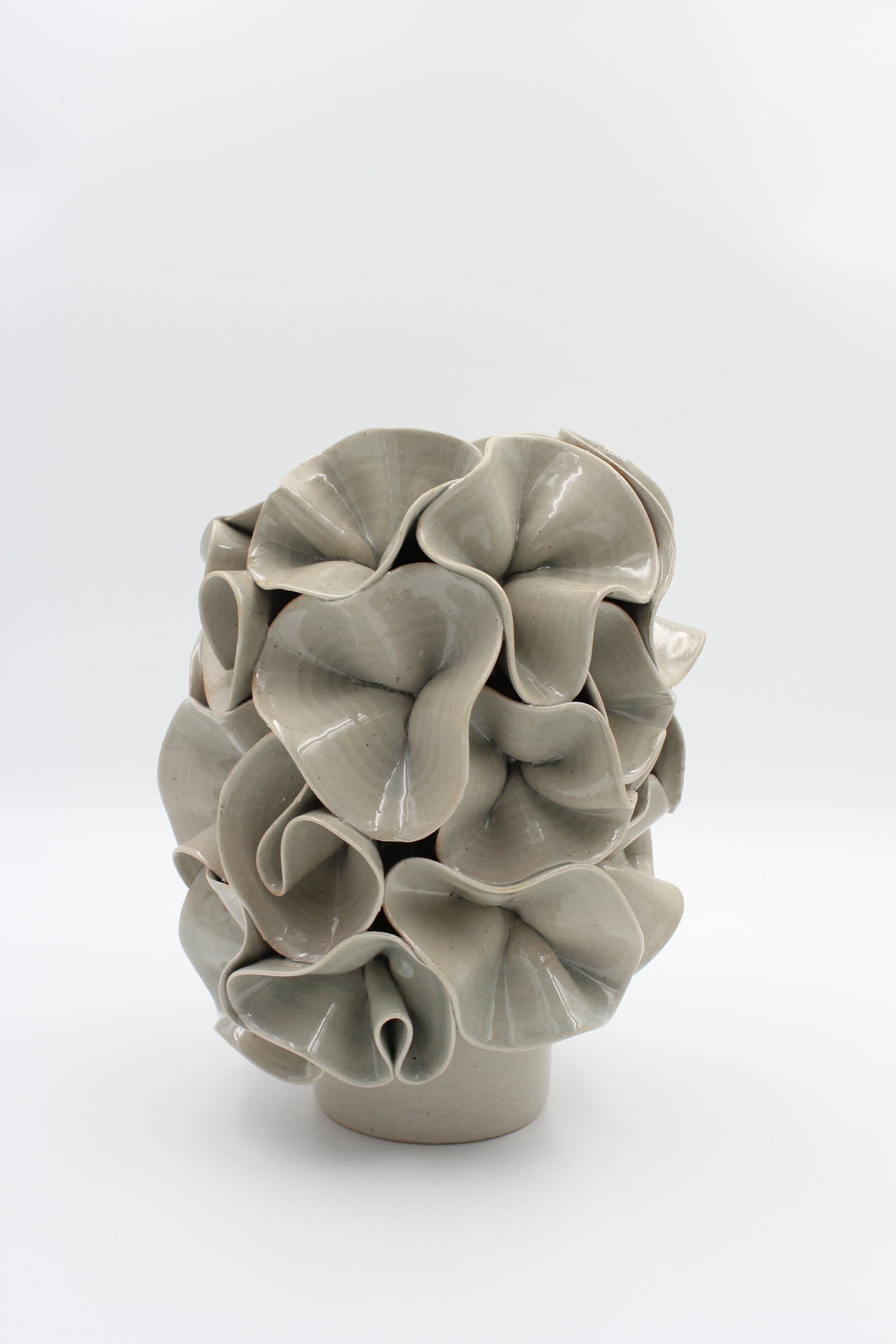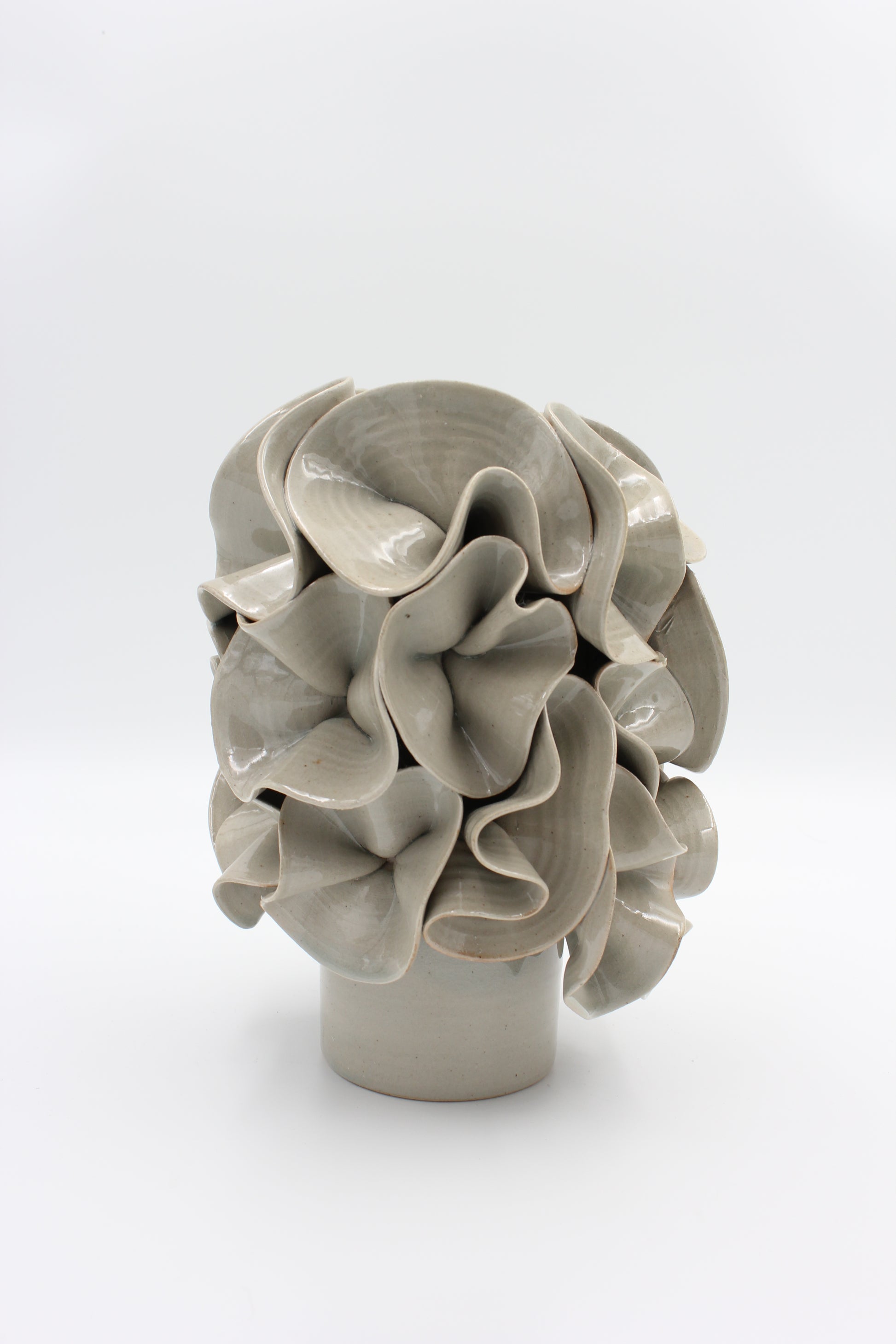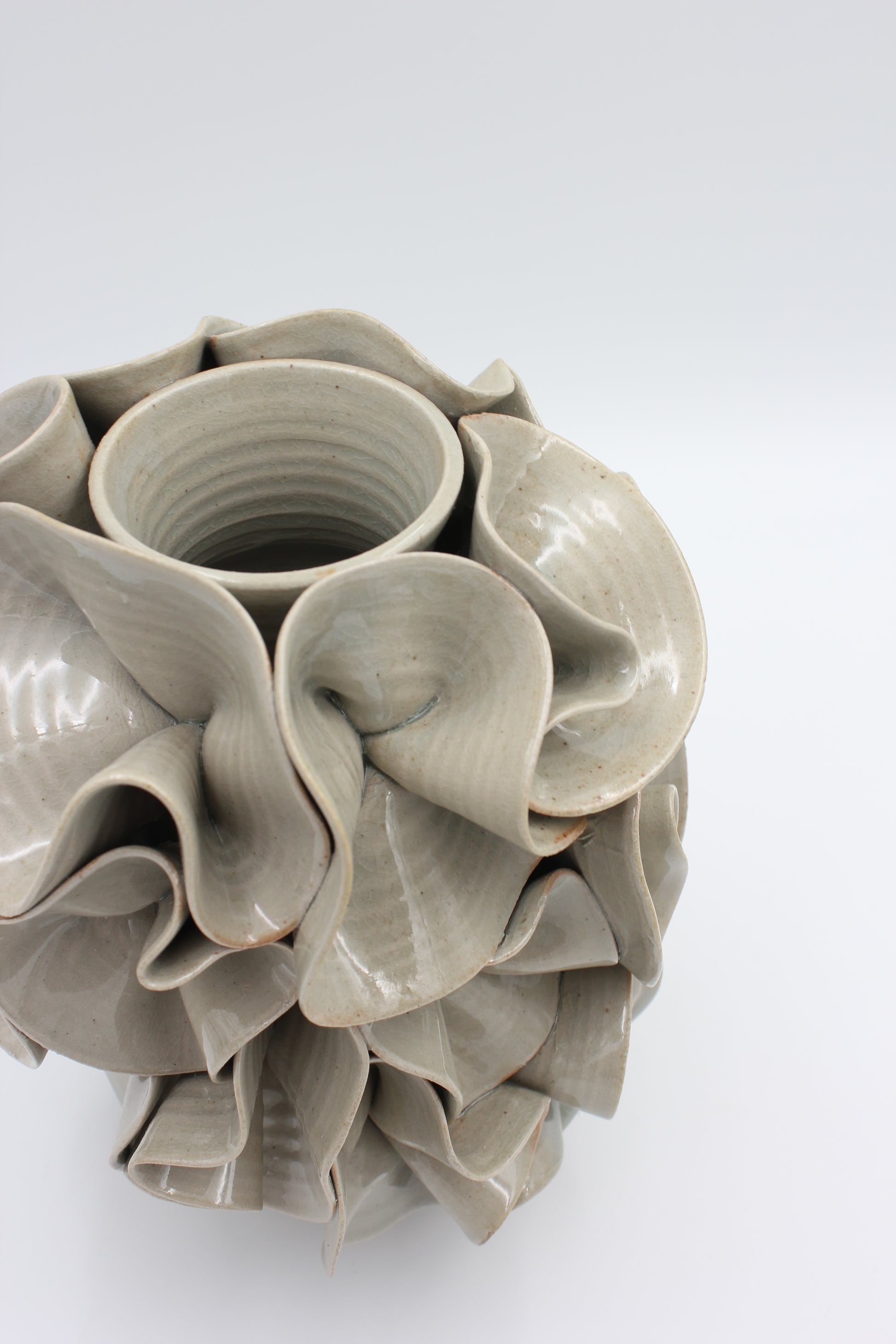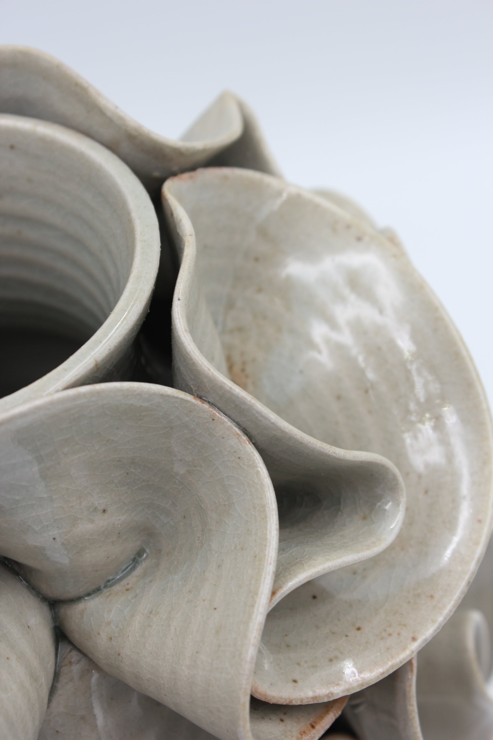 Del för del, drejas, formas och byggs samman med den bredvid. Små beståndsdelar som bygger en hel form. I ugnen färdas elden runt kärlen likt vattnen runt stenarna i bäcken. Elden träffar kärlet på ena sidan och dansar förbi på andra sidan. Det skapar ett helt unikt uttryck där varje föremål får sin egen personlighet.